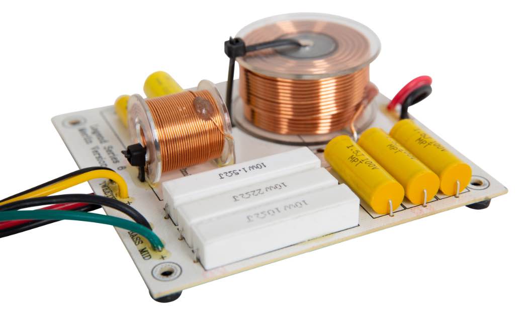 These New improved Drivers allowed us to take a New crossover design approach minimising the number of components required in the signal path. High-quality acoustic polypropylene caps with air cored and ferrite cored inductors for the mid/bass range and top end circuits were chosen.
